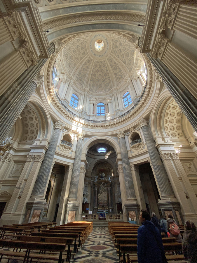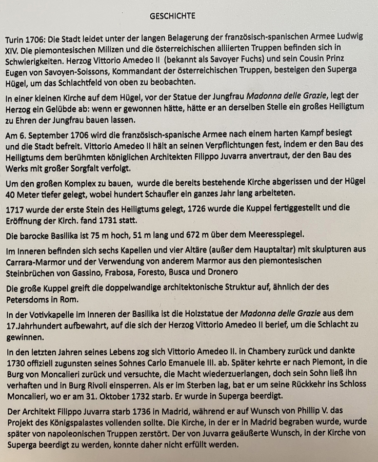 Am Nachmittag besuchten wir dann, da das kulturelle noch etwas zu kurz gekommen war, die barocke Basilika Superga auf einem Hügel gegenüber der Stadt, die wir mit einer nostalgischen Zahnradbahn erreichen konnten. Der Blick von diesem Hügel aus zu den weißen Gipfeln der nahen Alpen und über die Stadt war phänomenal.
