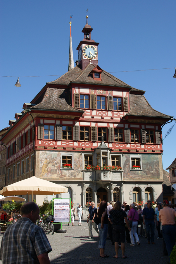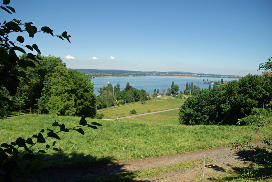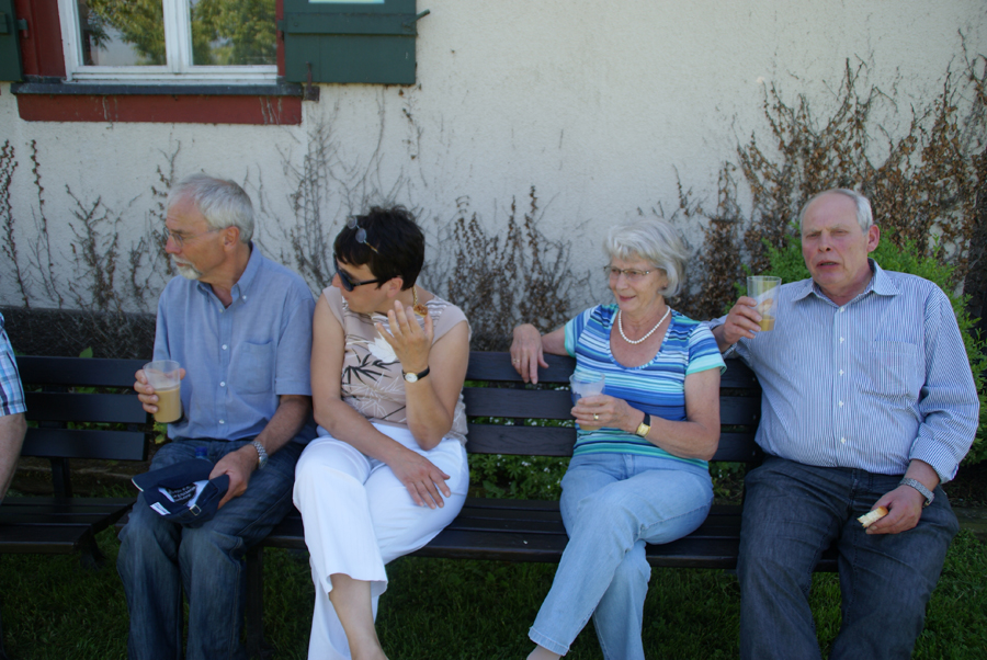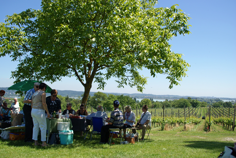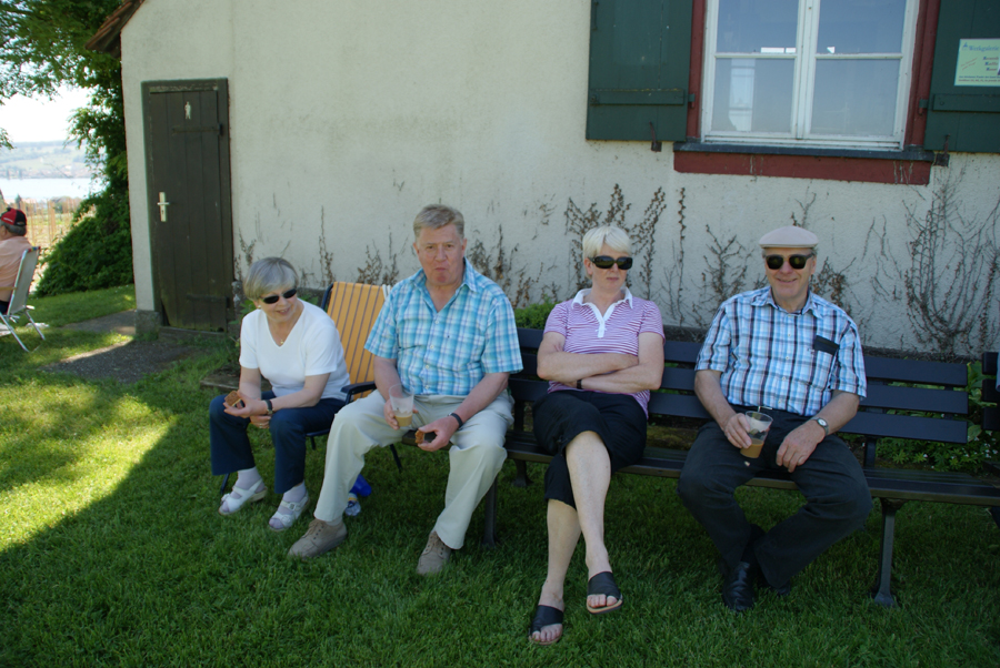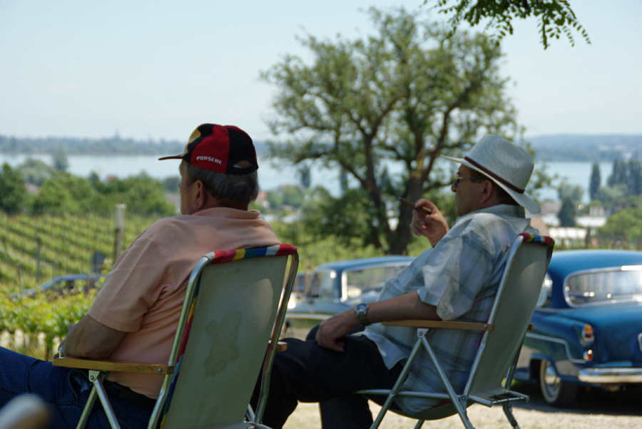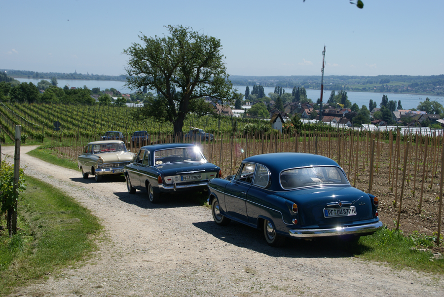 Am nächsten Morgen, wieder wurden vor dem Frühstück gewisse Reinigungsarbeiten an Glas und Karosse unserer Oldies ausgeführt, startete die ganze Mannschaft zu einer Ausflugsfahrt über den Bodanrück, die Insel Reichenau, Konstanz-Schweiz, Schloss Arenenberg (Napoleon-Museum), am Untersee und am Rhein entlang nach Stein am Rhein. Alle Sehenswürdigkeiten, die besucht wurden, von Oberzell (St. Georg) bis St. a. Rhein (hist. Stadtkern) präsentierten sich bei bestem Wetter unter strahlend blauem Himmel. Besonders zu erwähnen ist aber unser reichhaltiges Mittags-Pic-Nic, zu dem es nicht gekommen wäre, hätten nicht fürsorgliche Oldie-Heinzelmännchen am Abend zuvor zu später Stunde noch die Zutaten eingekauft. Eine Anhöhe auf der Reichenau, der Hochwartturm, umgeben von Weinbergen, war der Ort, auf dem sich die Oldie-Gemeinde einfand und es sich nach allem herbei geschafften (Essen, Trinken, Klappstühle, Gartenbänke) unter Obstbäumen auf grüner Wiese gut gehen ließ. Die herrliche 360º-Rundumsicht war faszinierend und überdies auch noch gratis. Die Rückfahrt ins Hotel über Höri, Radolfzell und Ludwigshafen gestaltete sich problemlos. Nicht ganz so das Essen am Abend in der Veranda am Seeufer, leider etwas enttäuschend für einen Abschlussabend; dafür hat es aber mit den Getränken geklappt, die dann für gute Stimmung in fröhlicher Runde und angeregte Gespräche gesorgt haben.