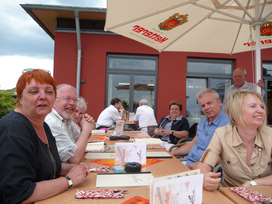 Am Sonntag ging unser Aufenthalt in Sipplingen zuende, um 9³º Uhr starteten alle Richtung Heimat. Der Routenvorschlag wurde um einen Besuch in Altheim erweitert, dort gab es ein Oldtimertreffen mit Traktoren, Unimog’s, PKW’s und Motorrädern. Interessant war auch eine Werkstatt, die mit alten Maschinen, Geräten und Motormodellen (z.B. Schwingkolbenmotor) zu besichtigen war. Nach kurzem Stop in Heiligenberg ging es weiter über Pfullendorf (dazwischen Mittags-Pic-Nic), Sigmaringen und die Schwäbische Alb. Vielleicht war es unserem Kleinsten in der Flotte, de sich bis dahin wacker gehalten hatte, etwas zu warm und gewittrig; er wollte halt trotz guten Zuredens nicht mehr. So blieb er wohl verwahrt in Mägerkingen zurück, von wo er am nächsten Morgen per Hänger von treuen Helfern heimgeholt wurde. Leider erwischte es auch noch den Ältesten unserer vierrädrigen Lieblinge. Mit nachlassender Leistung, einem etwas seltsamen Geräusch und einem kleinen Pfützchen versagte er seiner tapferen Chauffeurin den Dienst und blieb kurz hinter Tübingen auf einem Parkplatz stehen. Schnell wurde er umhegt von den Oldtimer-Kollegen, fachkundig wurden Kerzen getauscht, ebenso Ratschläge; der mitgeführte Kompressionstester zeiget auf den Zylindern 2+3 keinen Druck, also ein Fall für den ADAC, der nach etlichen Telefonaten und Wartezeit gegen 19³º Uhr eintraf und Auto und die beiden Besitzer sicher heimbrachte. Die letzten von insgesamt ca. 650 km gingen dann eigentlich problemlos vonstatten, die heimatlichen Gefilde kamen immer näher, doch beim letzten Anstieg zum Lokal Zauberblume in Grunbach, wo wir einen gebührenden Abschluss unserer schönen Fahrt feiern wollten, grummelte „Sir A“ und wollte zu guter letzt noch eine Sonderbehandlung mittels Abschleppseil durch einen jüngeren Landsmann. Wie sich später herausstellte, führten die Kontakte zu der vorübergehenden Unpässlichkeit. That’s very british. Nun ja. Also auf der Terrasse der Zauberblume, grandioser Aussicht, schwül, Gewitter im Anzug, trotzdem gute Stimmung. Es war eine wunderschöne Fahrt mit vielen Erlebnissen und alles, bis auf die 3 Pechvögel, gut gegangen. Per Handy erfuhren wir dann auch erleichtert, dass die Tübinger Crew „hoch auf dem gelben Wagen“ heimwärts fuhr. Die standhaften Terassen-Sitzer kamen, nachdem der aufgekommene Sturm einige Sonnenschirme, Gläser und was sonst noch so auf den Tischen stand, umblies, nach heftig einsetzendem Gewitterguss nach drinnen. Somit waren der Beginn und das Ende unserer Ausfahrt recht feucht, die Stimmung aber stets fröhlich. Zufrieden danken wir daher den Organisatoren Paul, Herbert und Harald, jeweils mit Anhang, für Vorbereitung und Ausführung dieser schönen Reise ganz herzlich.
