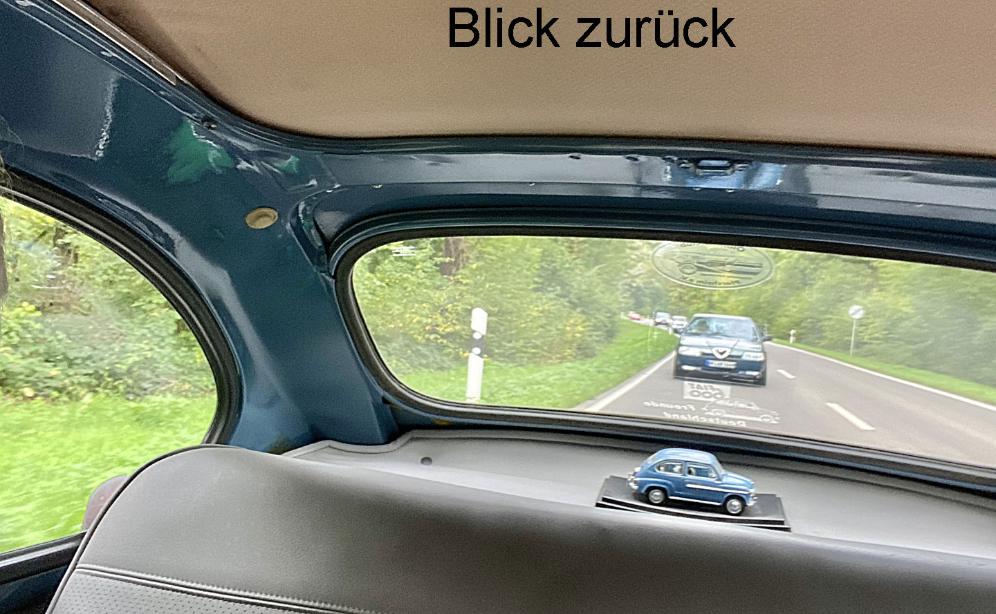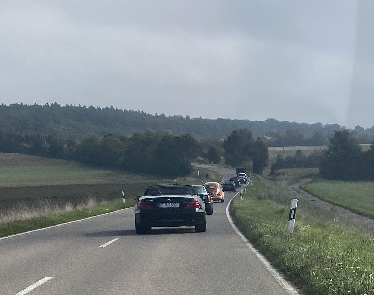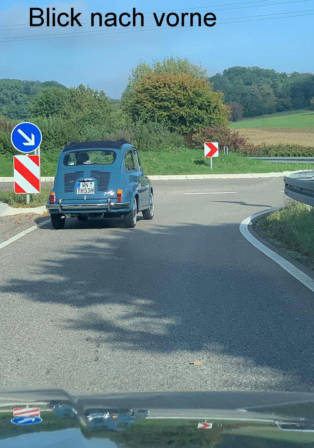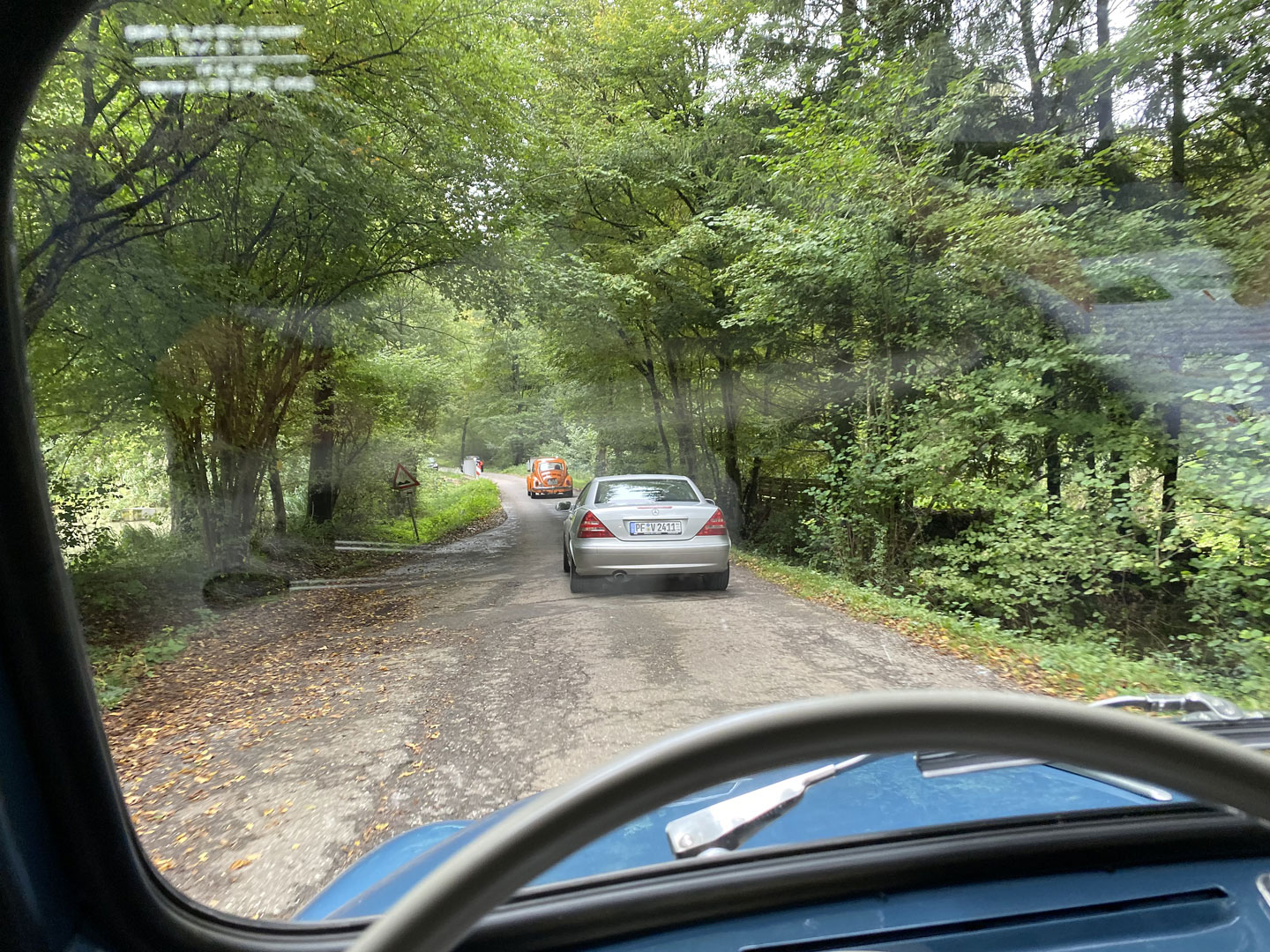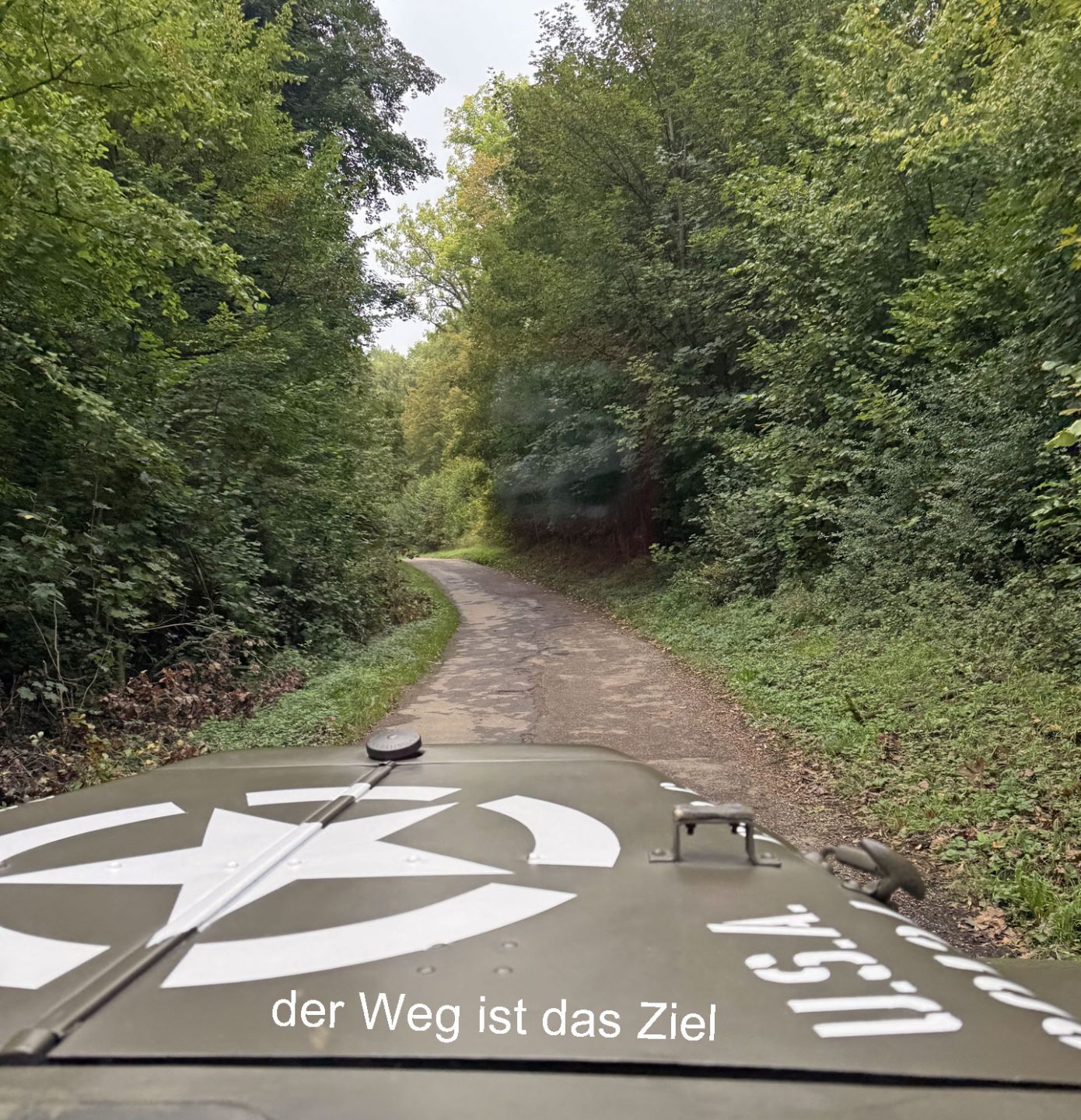 Schnell verschwindet die erste Gruppe von Oldtimern am Horizont. Umso einprägender wird die einsame Fahrt über die engen Waldsträsschen zwischen Schützingen und Diefenbach für den nachfolgenden Dodge WC und den Alfa 164. Immerhin, beide in passendem, dunklen Grün lackiert. Den blauen NSU/Fiat Jagst 770 weit vor uns werden wir bis Flehingen wohl nicht mehr einholen können. An Steigungen ist er einfach zu flink.