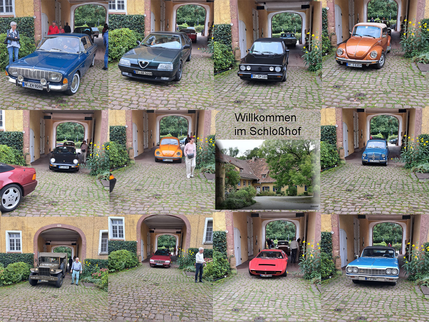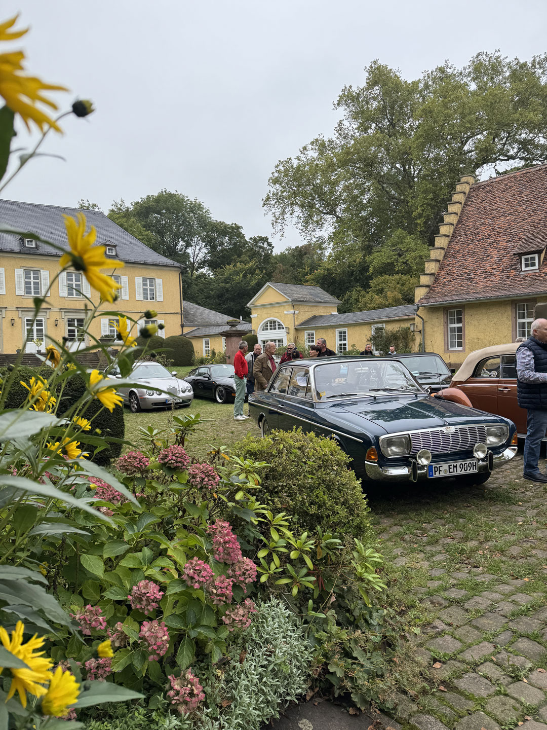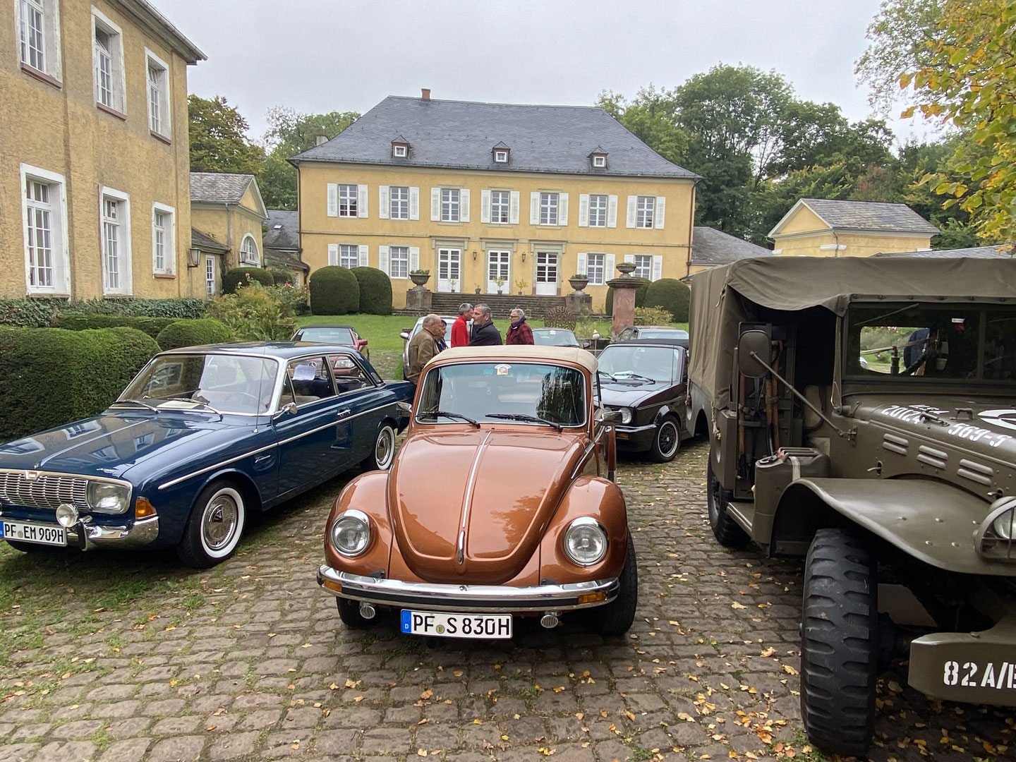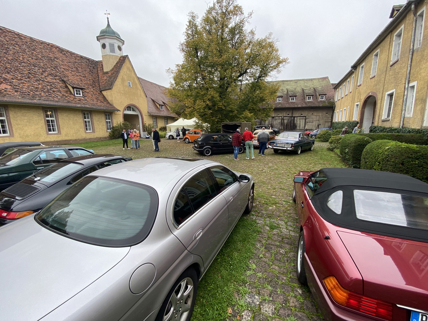 Kühl, aber sonnig, startet die Tour über Kieselbronn und einem nicht jedem bekannten Abzweig nach Dürrn; vorbei an der „Bettlereiche“, einem knorrigen, jahrhundertealten Charakterbaum. 30 Minuten später durchgleiten die ersten Fahrzeuge das große Eingangsportal zum Innenhof des Bauschlotter Schlosses. Goldene und orangene Käfer, ein roter Maserati Bora, sowie bunte Preziosen von Chevrolet, von Ford bis Jaguar und Porsche füllen stilecht das sie umgebende herrschaftliche Ambiente aus dem 18./19. Jahrhundert.