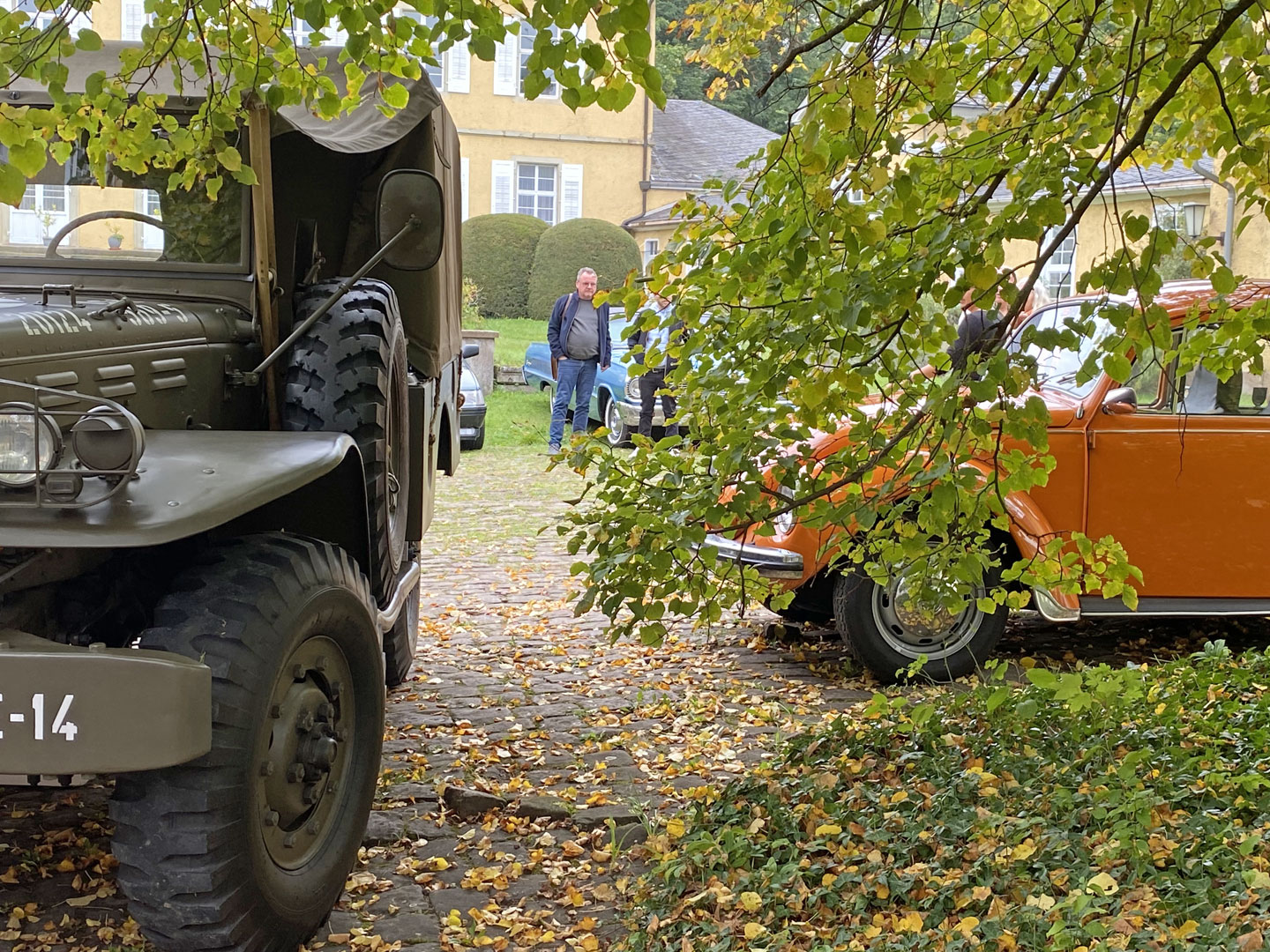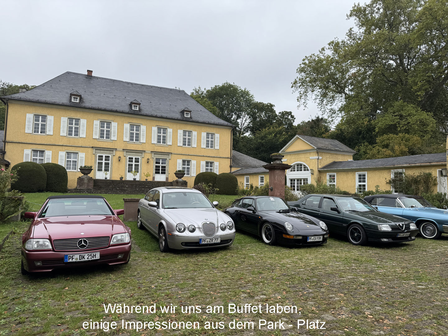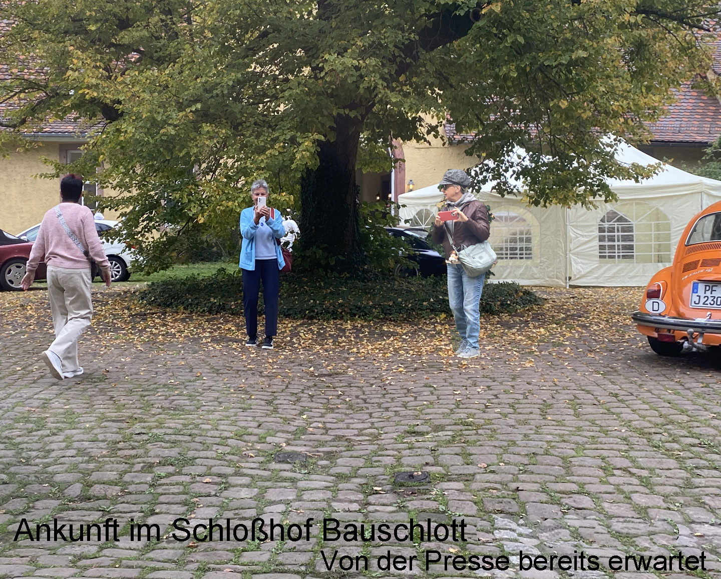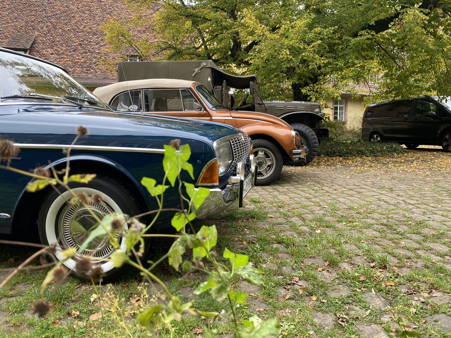 Kühl, aber sonnig, startet die Tour über Kieselbronn und einem nicht jedem bekannten Abzweig nach Dürrn; vorbei an der „Bettlereiche“, einem knorrigen, jahrhundertealten Charakterbaum. 30 Minuten später durchgleiten die ersten Fahrzeuge das große Eingangsportal zum Innenhof des Bauschlotter Schlosses. Goldene und orangene Käfer, ein roter Maserati Bora, sowie bunte Preziosen von Chevrolet, von Ford bis Jaguar und Porsche füllen stilecht das sie umgebende herrschaftliche Ambiente aus dem 18./19. Jahrhundert.