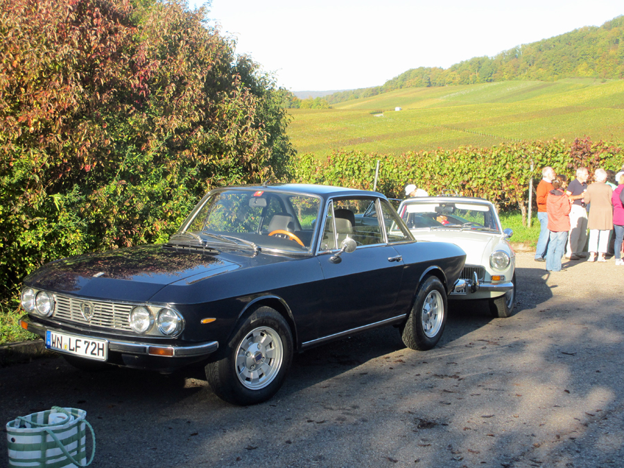 Die Oldtimertour führt auf Nebenstraßen in Richtung Stromberg durch kleine Ortschaften nach Hohenhaslach in den oberen Ortsteil hinter der Kelter zum Grillplatz. Von Weinbergen umgeben machen wir hier unseren 1. Boxenstopp mit Brezeln, Würstchen und den mitgebrachten Getränken. Auch unser Caruso, ein Irish Setter ist als ständiger Begleiter unserer Ausfahrtenwieder mit dabei. Den schönen Ausblick mitten in den Weinbergen über das Land genießen wir alle.