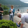 Der letzte Tag vor Ort, so ergab es sich dann eben, war ebenfalls ein Highlight. Dass uns Pisa gefallen würde, davon sind wir schon vorher ausgegangen. Wir wurden nicht enttäuscht. Der Knaller war aber das kleine Städtle Lucca, das uns von der fachkundigen Simonetta vermittelt wurde. Einfach nur schön, diese von einer gewaltigen Stadtmauer (eigentlich mehr ein breiter Wall) umsäumten Stadt. Der Wolkenbruch am Nachmittag (das Eis war gerade geschleckt) hat eher Spaß als Frust gemacht – Die Schirmverkäufer hatten übrigens Hochsaison. Na ja, was bleibt noch: die Heimfahrt eben. Muss halt sein. Mit Abstecher an den Comer See und – na klar – Picknick direkt am Ufer ein würdiger Abschied aus Italien. In Bötzingen dann großer Abschied nach einem leckeren Abendessen und schon war eine Woche, gefüllt mit allerlei Erlebnissen, wieder zu Ende.
