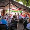Gesagt getan, bald waren wieder alle zusammen und fuhren weiter nach Munchhausen in das Restaurant a la Rose, wo das Mittagessen bestellt war. Die Terrasse unter den beiden großen Platanen war schon vorbereitet, die Tische eingedeckt und zusätzlich beschattet durch Sonnenschirme. Die Idee, das Essen bereits mit der Anmeldung zu bestellen, zahlte sich aus,denn obwohl wir mit rd. 50 Personen zugegen waren, gab es keine lange Wartezeiten. Zumindest waren kulinarisch alle zufrieden, als wir uns gegen 14:00 Uhr für die Weiterfahrt bereit machten.