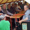 Jetzt aber aufgesessen. Gleich drei Traktoren (einer davon ein Lamborghini) ziehen die bunten Wägen durch die Orte und die Weinberge. Die Stimmung ist perfekt, an jedem der drei Haltepunkte werden wir durch Vater und Sohn Schmidlin in die Geheimnisse des Kaiserstühler Weinbaus eingeführt und genießen diesen auch. Zudem immer wieder tolle Aussichten und Geschichten. Ein leckerer und lehrreicher Nachmittag, an dessen Ende leider etwas Regen tröpfelt. Daher speisen wir auch leider nicht auf der Terrasse (L), sondern im Lokal, was uns aber egal ist, der Tag hat’s gebracht – und ist noch nicht zu Ende. Denn der Chef des Hauses, Herr Baptist zeigt uns noch beim Nachbarn eine alte Ölmühle für Walnussöl, die aber noch voll funktionstüchtig ist.
